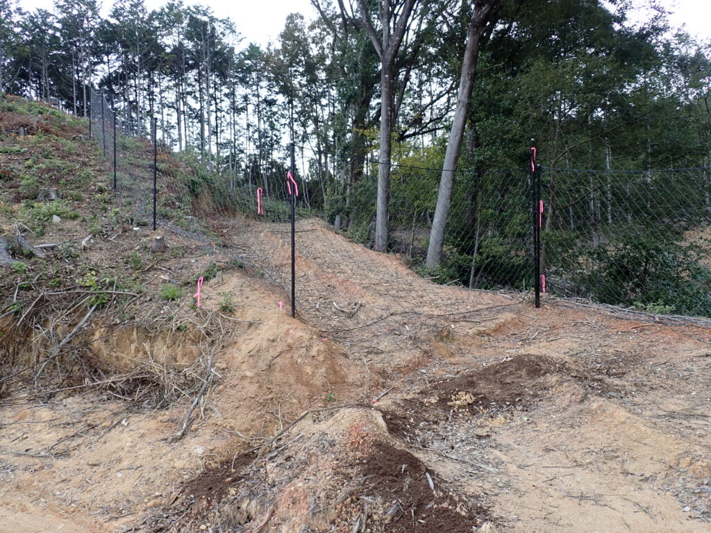 植栽した苗木がシカやイノシシなどの野生動物に浸食されないように植栽地をネットで囲います。